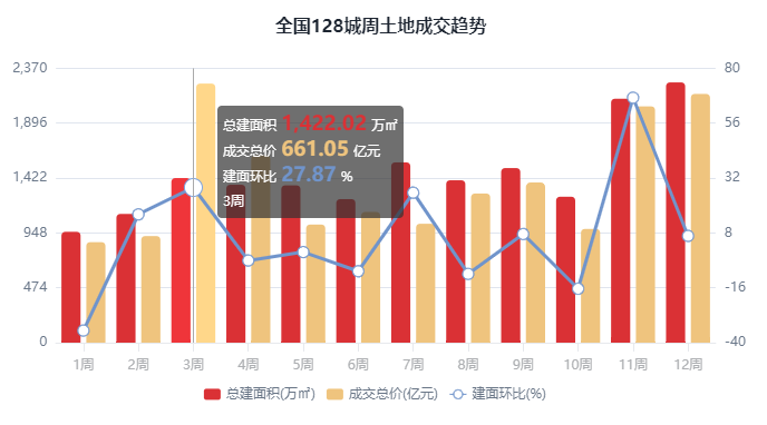 本周纯住宅共成交146幅,总建面积:894.54万㎡,较上周减少14幅;商住、商办及综合共成交289幅,总建面积:1291.85万㎡,较上周减少8幅。