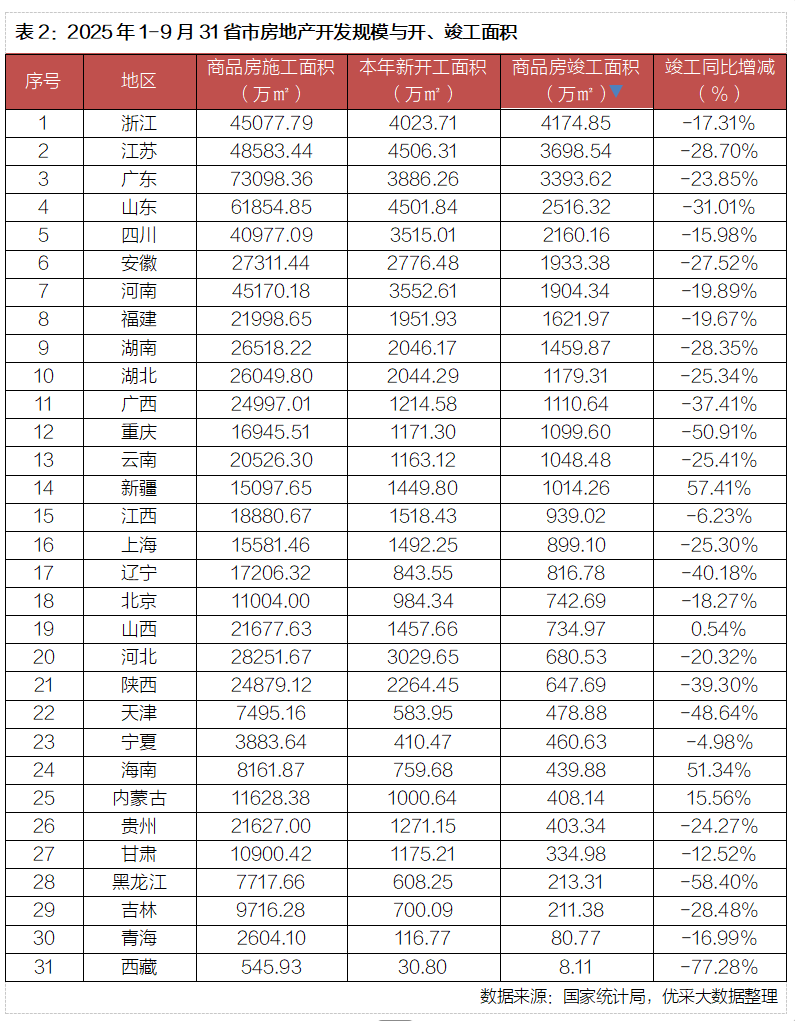 新开工面积方面,31省市1-9月房屋新开工面积共56051万㎡,同比下降22.2%;排名前三的是江苏4506.31万㎡、山东4501.84万㎡和浙江4023.71万㎡。竣工面积方面,31省市1-9月房屋竣工面积共36816万㎡,同比下降24.4%;排名前三的是浙江4174.85㎡、江苏3698.54万㎡和广东3393.62万㎡。