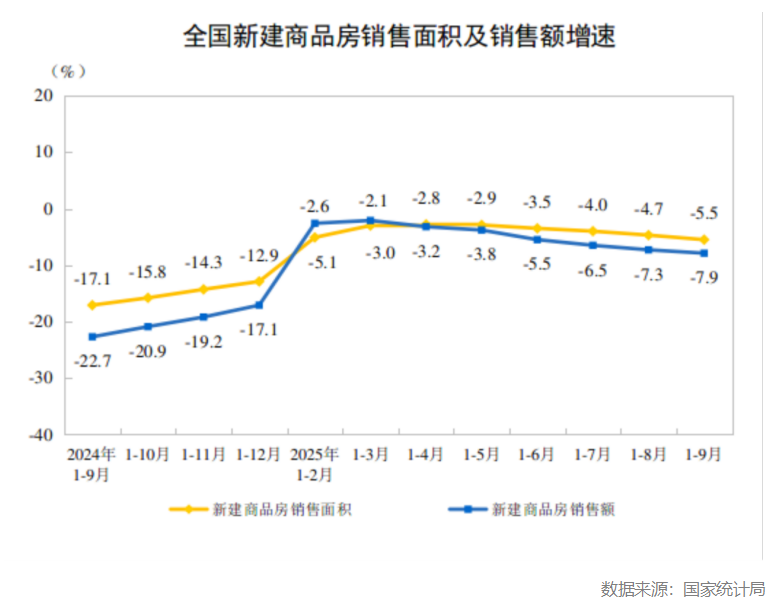 2025年1-9月房地产市场继续保持调整,商品房销售面积和销售额均有所下降。根据国家统计局数据,1-9月新建商品房销售面积65835万㎡,同比下降5.5%;新建商品房销售额63040亿元,同比下降7.9%。9月商品房销售面积、金额环比微降,单月同比和累计同比降幅收窄。房地产销售端仍处于下行趋势,行业“回暖”时刻尚未真正到来。