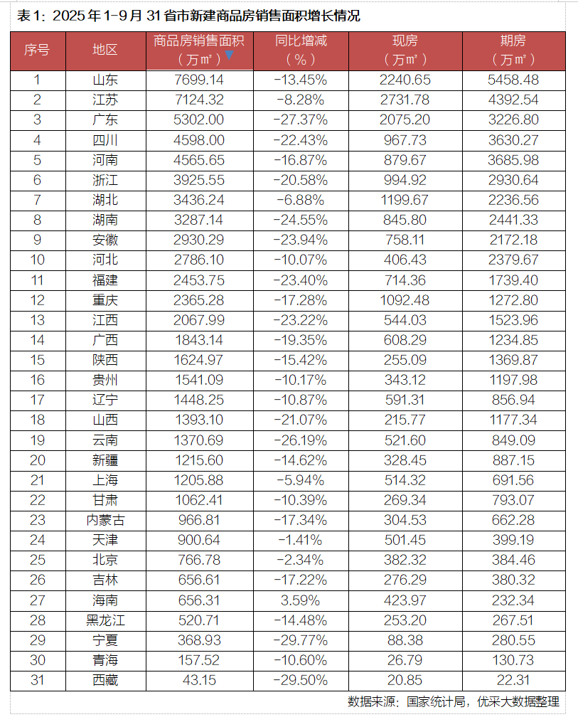 根据国家统计局数据,2025年1-9月,31省市的新建商品房销售额68880亿元,同比下降22.7%,其中住宅销售额下降24.0%。新建商品房销售面积70284万㎡,同比下降17.1%,其中住宅销售面积下降19.2%。新建商品房销售面积位列前五的是山东、江苏、广东、四川和河南,其中山东、江苏、广东商品房销售面积超5000万㎡。