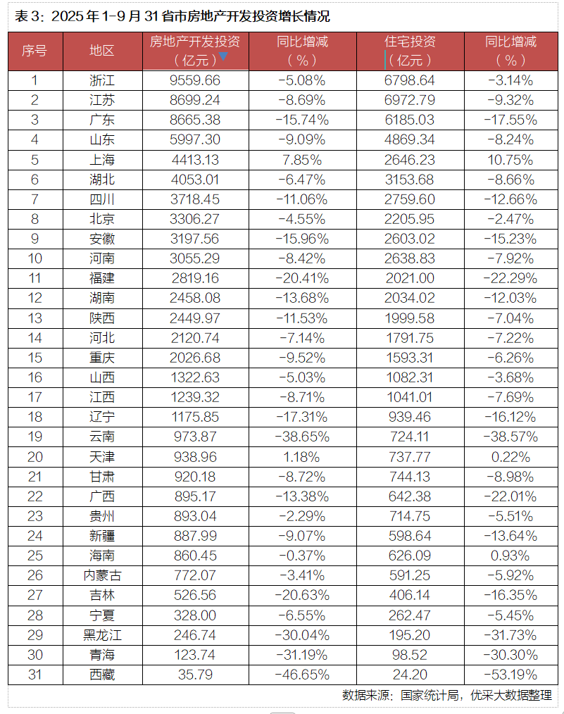 根据国家统计局数据,2025年1-9月,31省市房地产开发投资78680亿元,同比下降10.1%;其中,住宅投资59701亿元,下降10.5%。投资额排名前三的分别是浙江、江苏和广东,分别为9559.66亿元、8699.24亿元和8665.38亿元,投资额均在8000亿以上。西藏投资额最低,仅为35.79亿元。